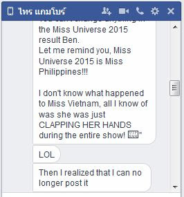 As Filipinos celebrate their 3rd Victory of Miss Universe Crown after 42 years, a Vietnamese named Ben Nguyễnrudely commented to a Cebuano's status, hailing the new queen as being proud Pinoy. Cebuano Cy said in a post, "Here's the video where Pia attempted to give the crown back to Miss Colombia. #MissUniverse2015" but Ben commented with a photo collage of Miss Universe Pia Wurtzbach beside an alien picture which implied the comparison of our very own Pia to an Alien. Cy replied with a question, "What happened to Miss Vietnam?" but as expected, Mr. Ben responded with "She feed the climb, he bought the results and have you, there's a long time, cheat?" (as translated by Google as the original comment was posted in Thai Language)